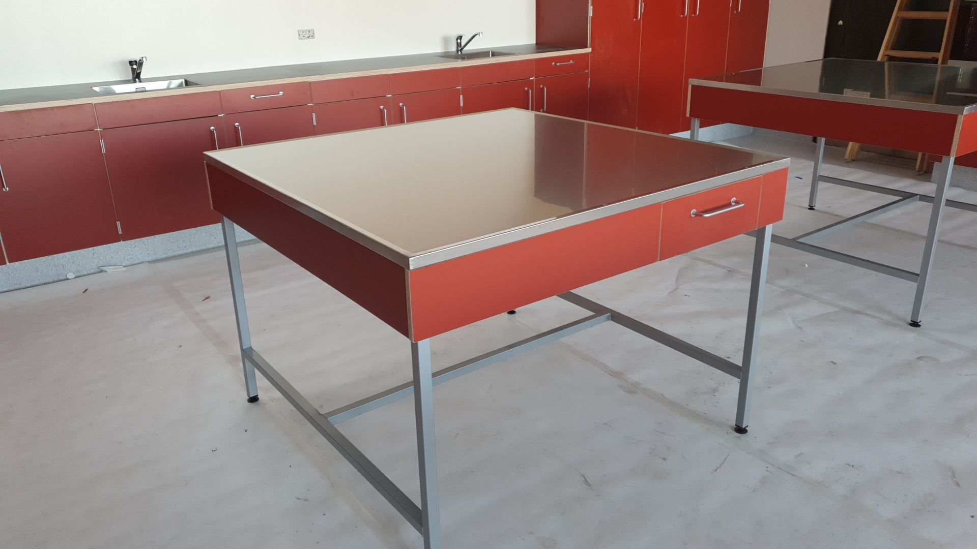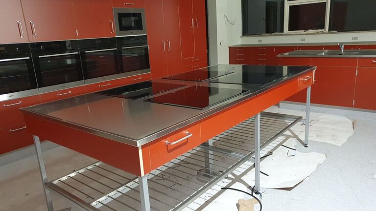Nye hjemkundskabslokaler til Dronninglund Skole med inventar i den flotte røde farve MAT Paprika og stålbordplader der skinner.
