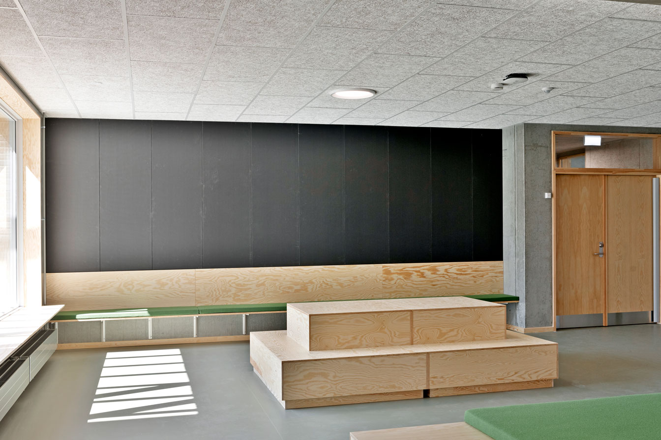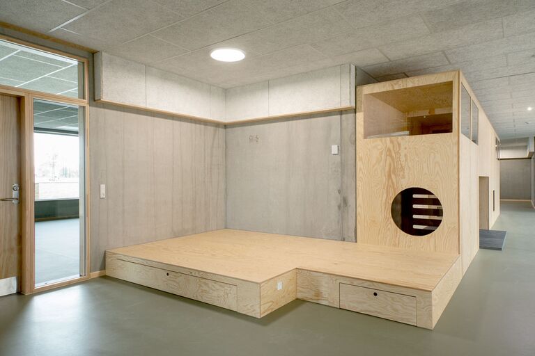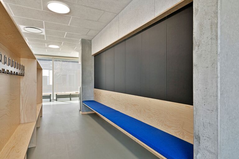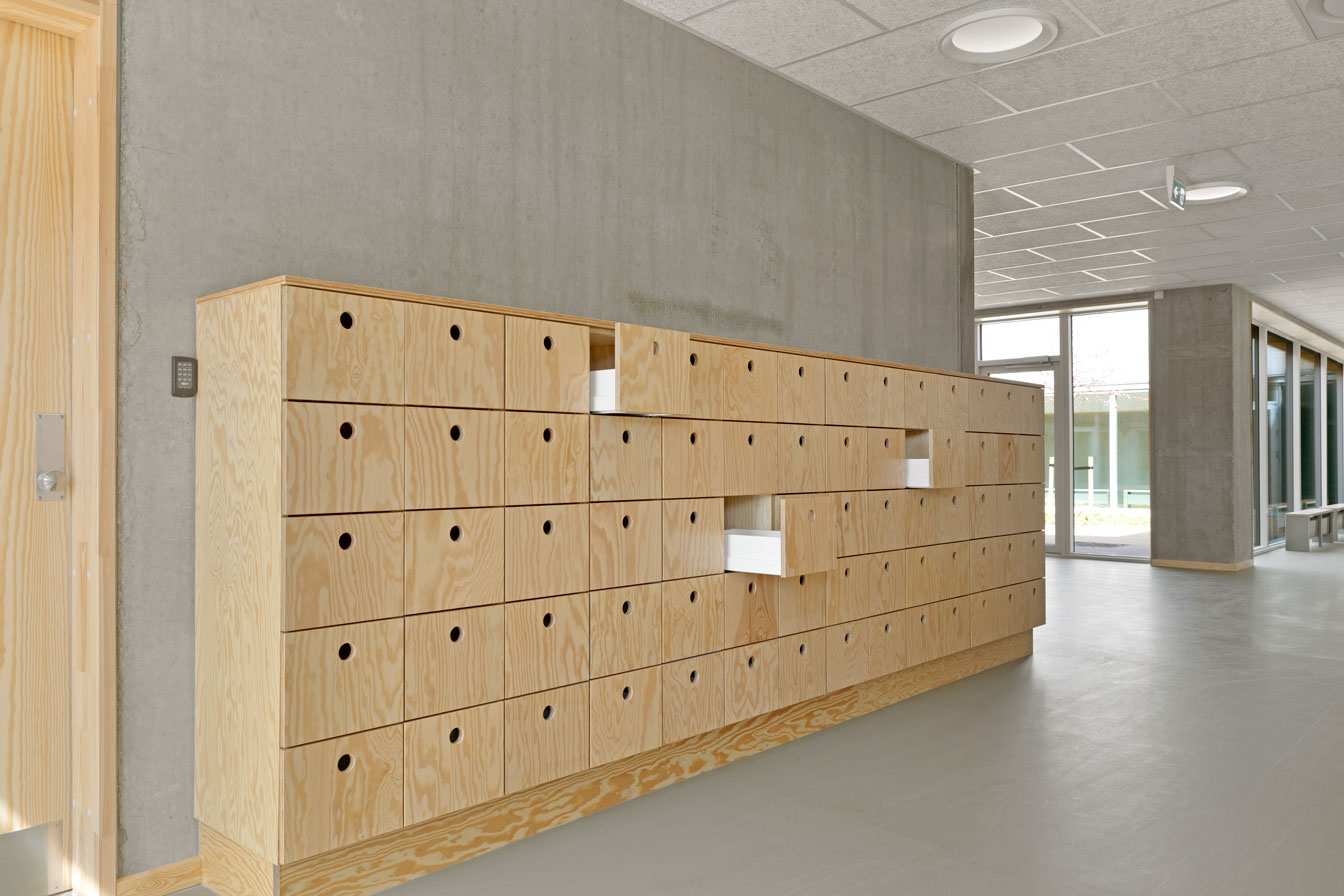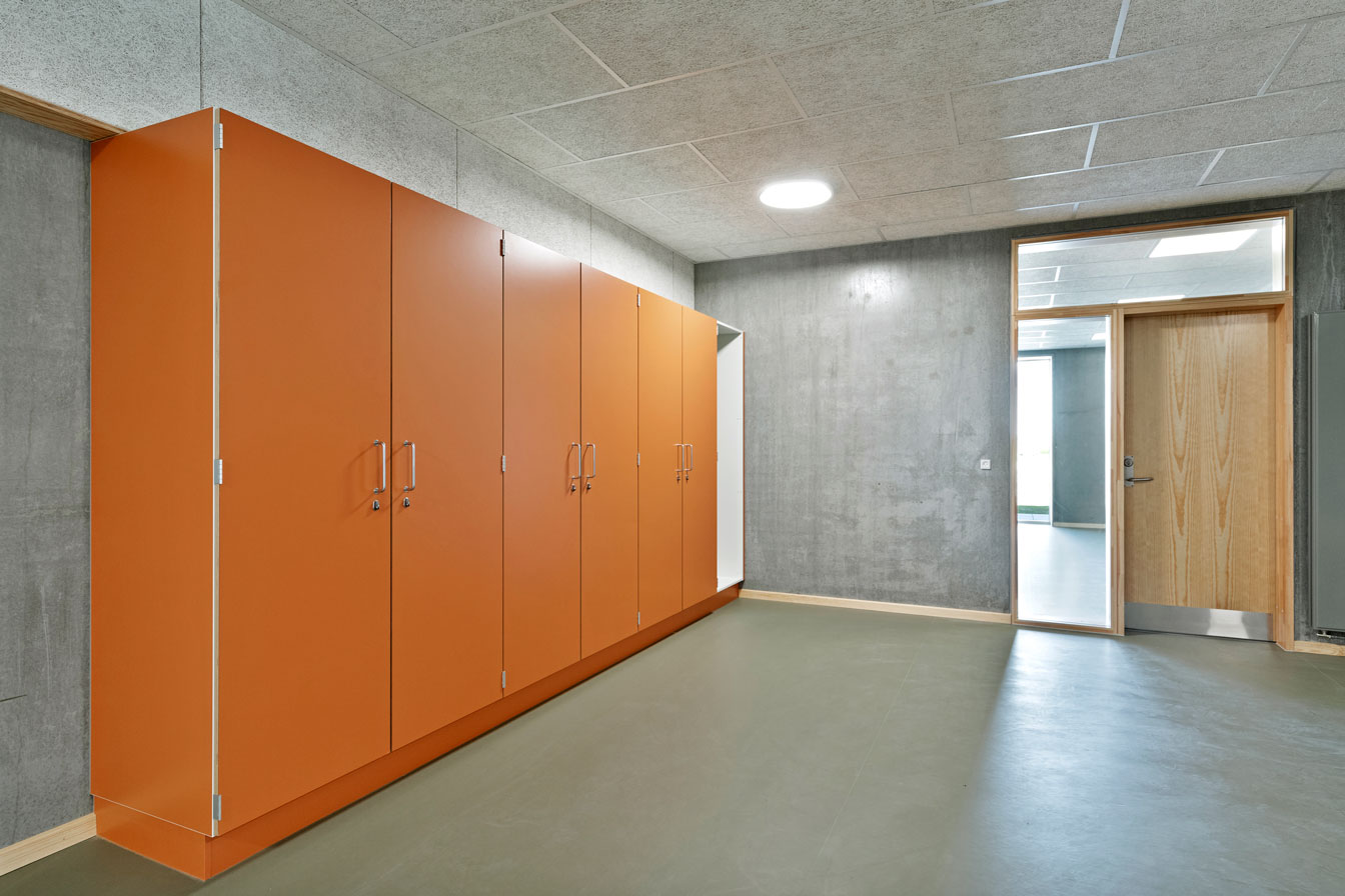Jammerbugt Municipality has granted us permission to share the video below, where the school principal and the architect discuss their thoughts behind the construction of Jetsmark School. In the background, you can see some of the furniture solutions provided by ST Skoleinventar, including podiums and windowsills made of the currently popular plywood, which is beautifully highlighted here in contrast to the cold concrete. Check out more inspirational images from this impressive project below.