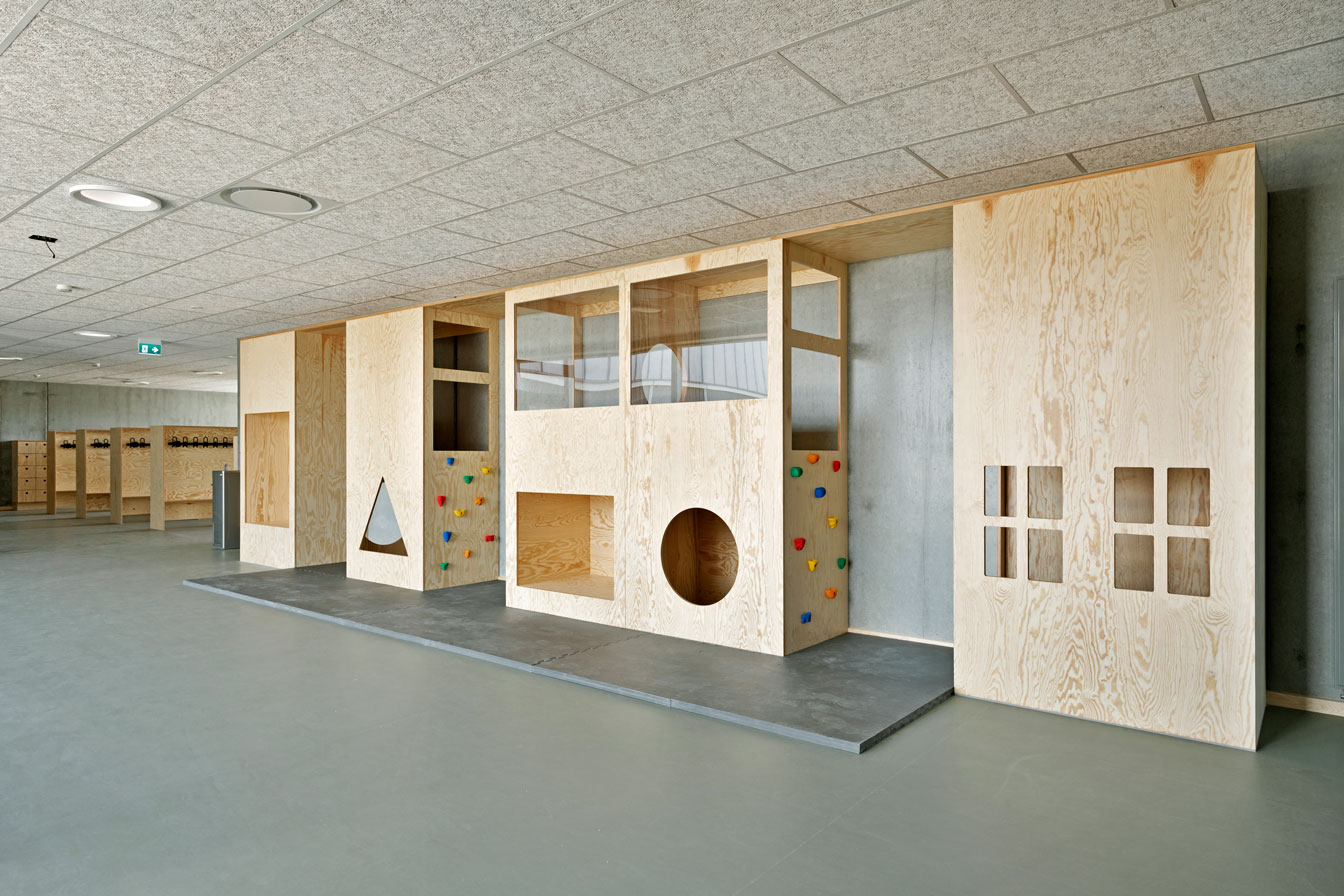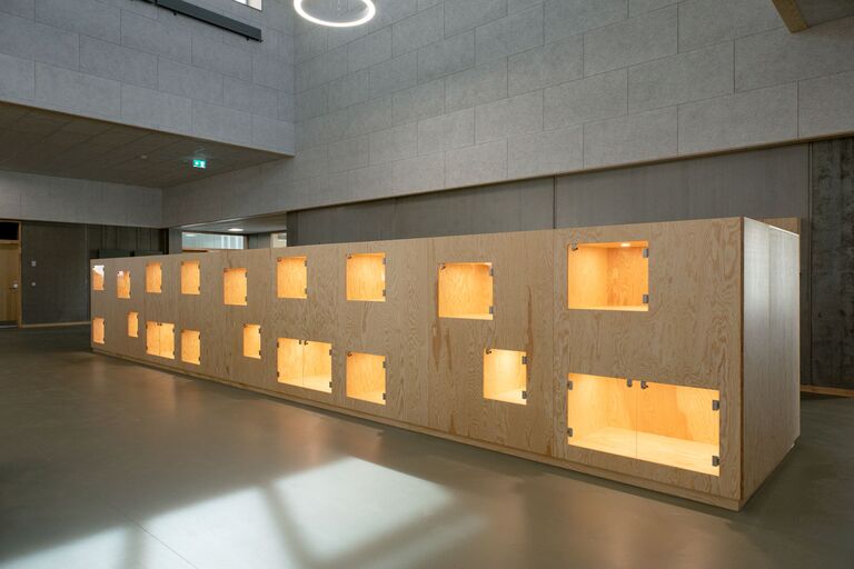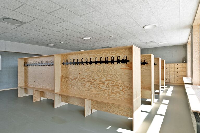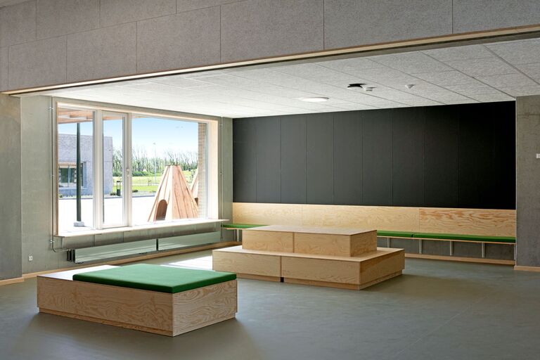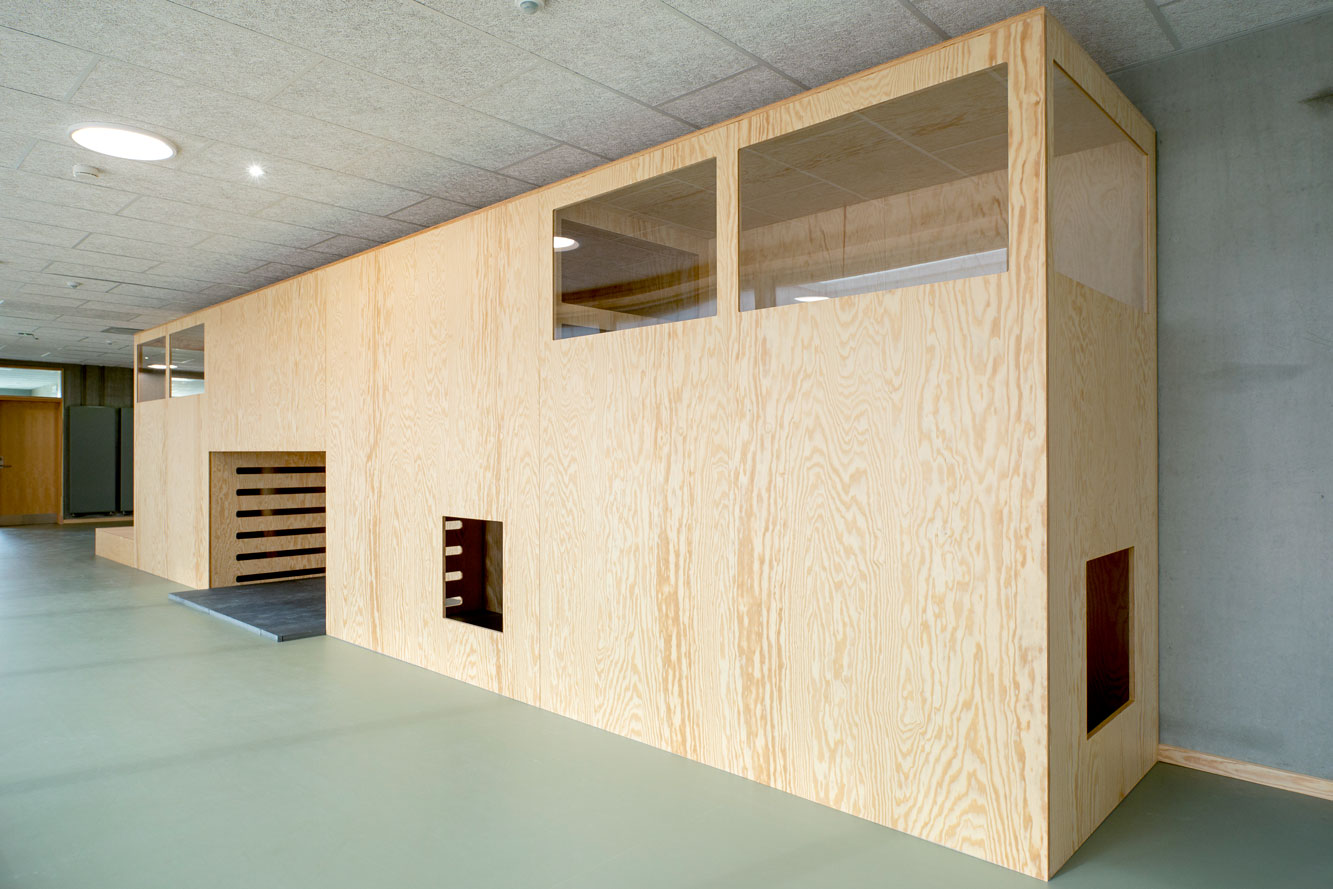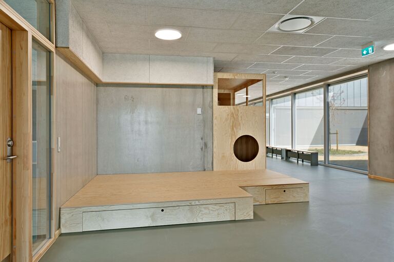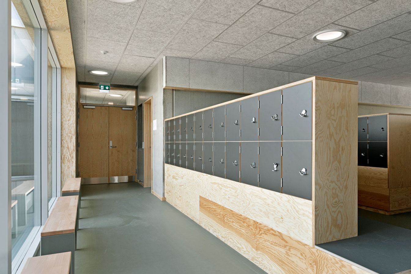 Jammerbugt Municipality has granted us permission to share the video below, where the school principal and the architect discuss their thoughts behind the construction of Jetsmark School. In the background, you can see some of the furniture solutions provided by ST Skoleinventar, including podiums and windowsills made of the currently popular plywood, which is beautifully highlighted here in contrast to the cold concrete. Check out more inspirational images from this impressive project below.