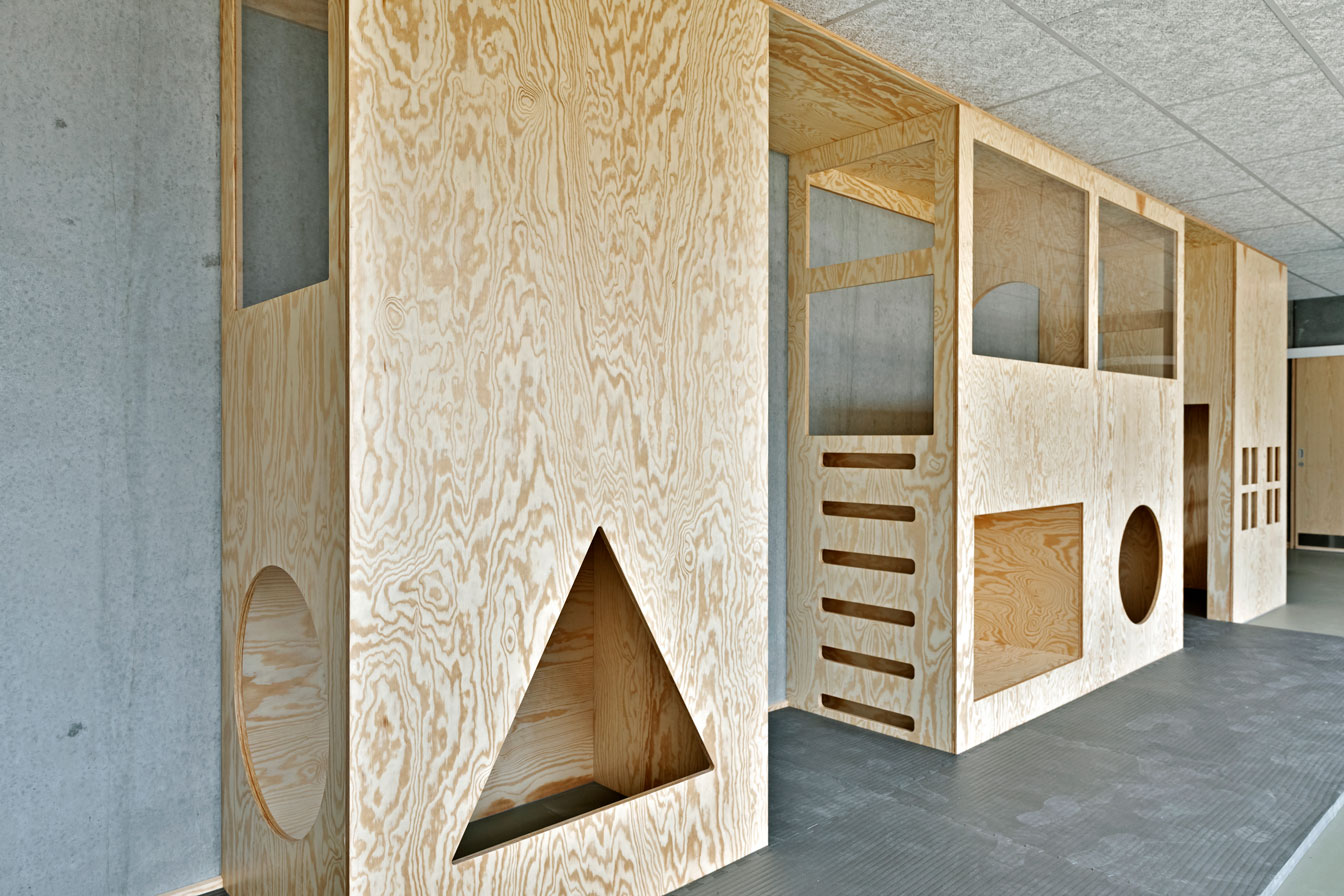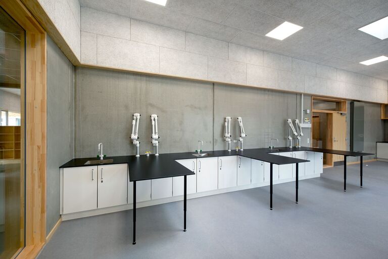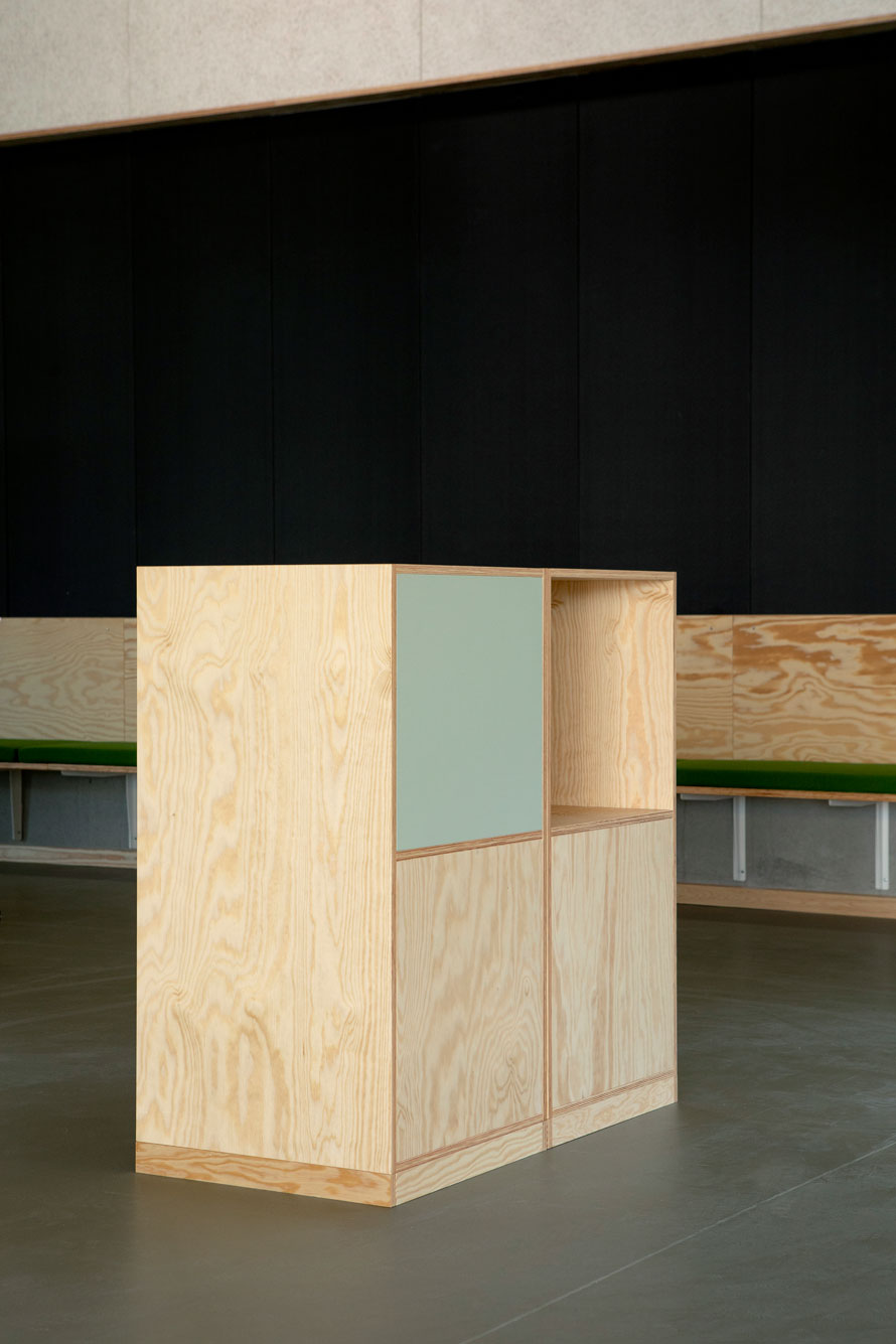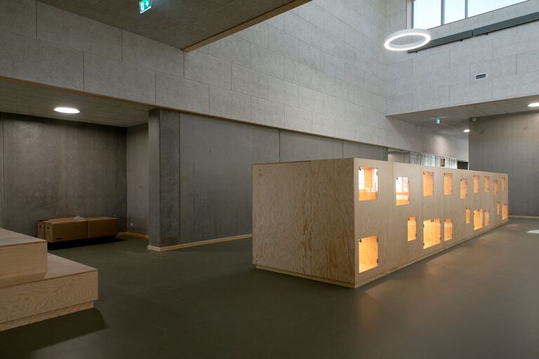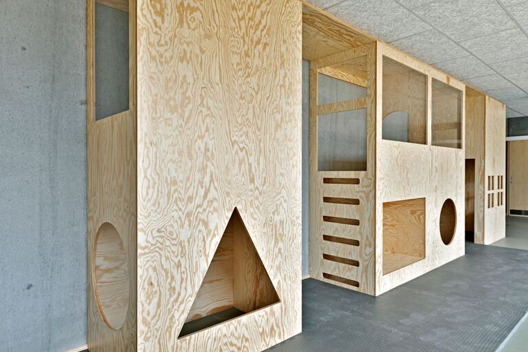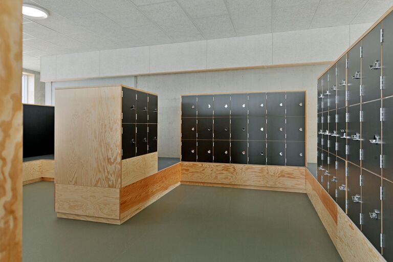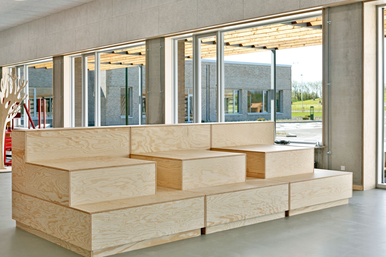 Jammerbugt Municipality has granted us permission to share the video below, where the school principal and the architect discuss their thoughts behind the construction of Jetsmark School. In the background, you can see some of the furniture solutions provided by ST Skoleinventar, including podiums and windowsills made of the currently popular plywood, which is beautifully highlighted here in contrast to the cold concrete. Check out more inspirational images from this impressive project below.